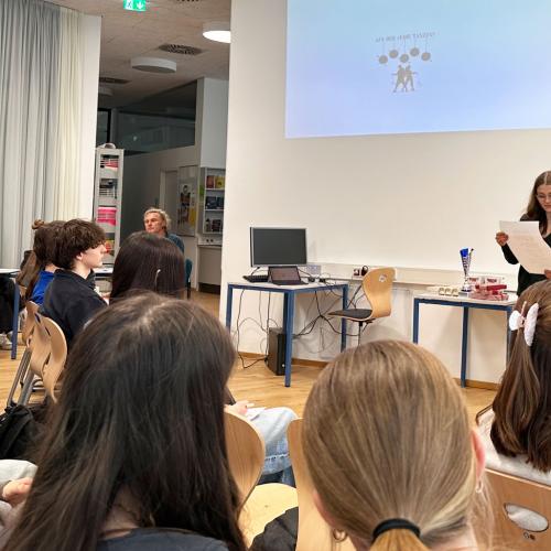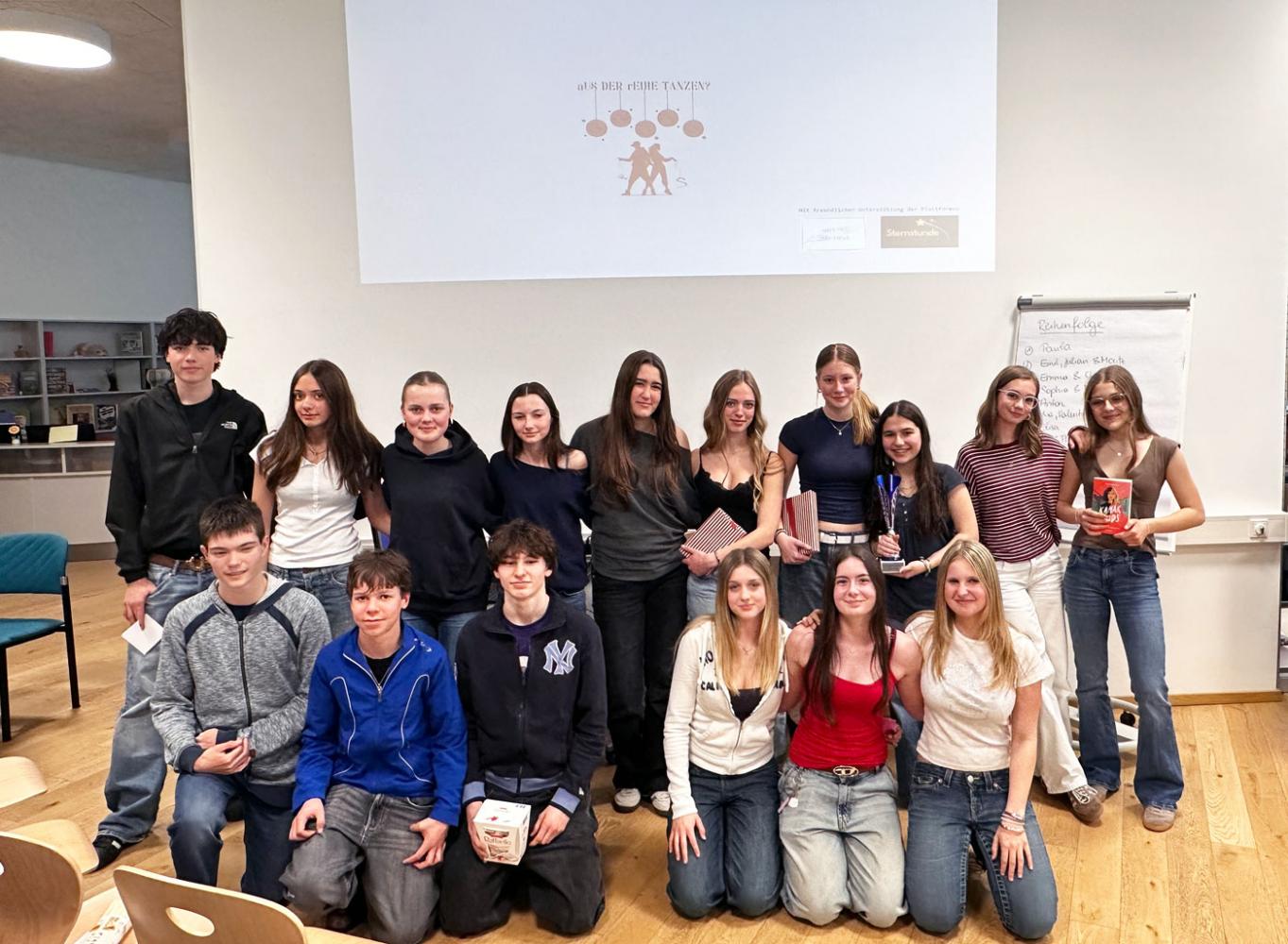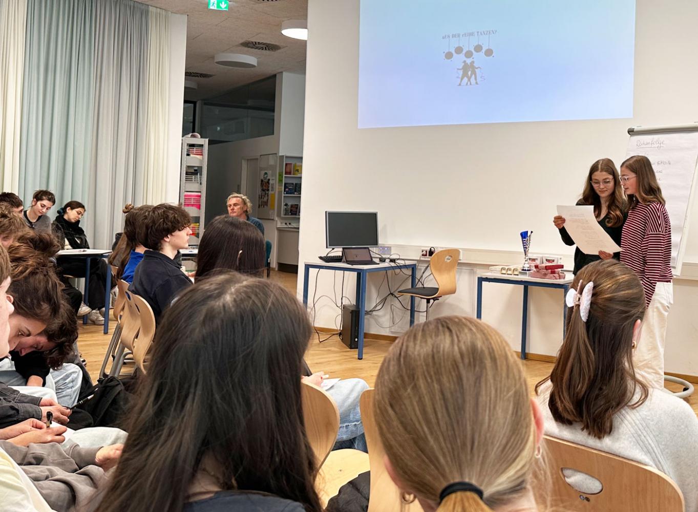 Zum zweiten Mal wurde der Poetry-Slam-Wettbewerb „Aus der Reihe tanzen?“ in der Oberstufe durchgeführt. Dieses Mal gaben die Schülerinnen und Schüler der 5. Klassen im Fach Ethik ihre Texte zum Besten.
