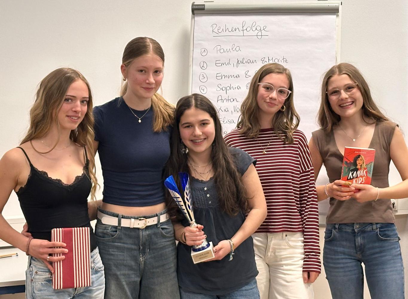 Was es bedeutet, ein gutes und gelungenes Leben zu führen, ist eine Frage, die nicht leicht zu beantworten ist. Gerade deshalb lohnt sich eine ausführlichere Auseinandersetzung damit im Rahmen des Ethikunterrichts. Die drei Gruppen der 5. Klassen setzten ihre eigenen Ideen in Form kreativer Poetry-Slam-Text um und insgesamt neun Einzelpersonen bzw. Kleingruppen trauten sich dann auch, diese vor den drei Gruppen sowie einer Expert:innenjury vorzutragen. Besonders überzeugend fanden die Zuhörer:innen den Text von Clara und Emma (5A), den wir hier auch veröffentlichen möchten. Die Gewinnerinnen freuten sich über einen Pokal, die drei Erstplatzierten über interessante Jugendromane zum Thema.