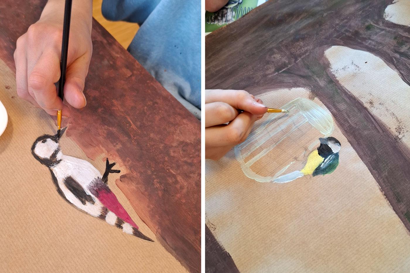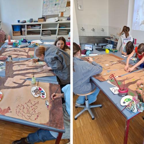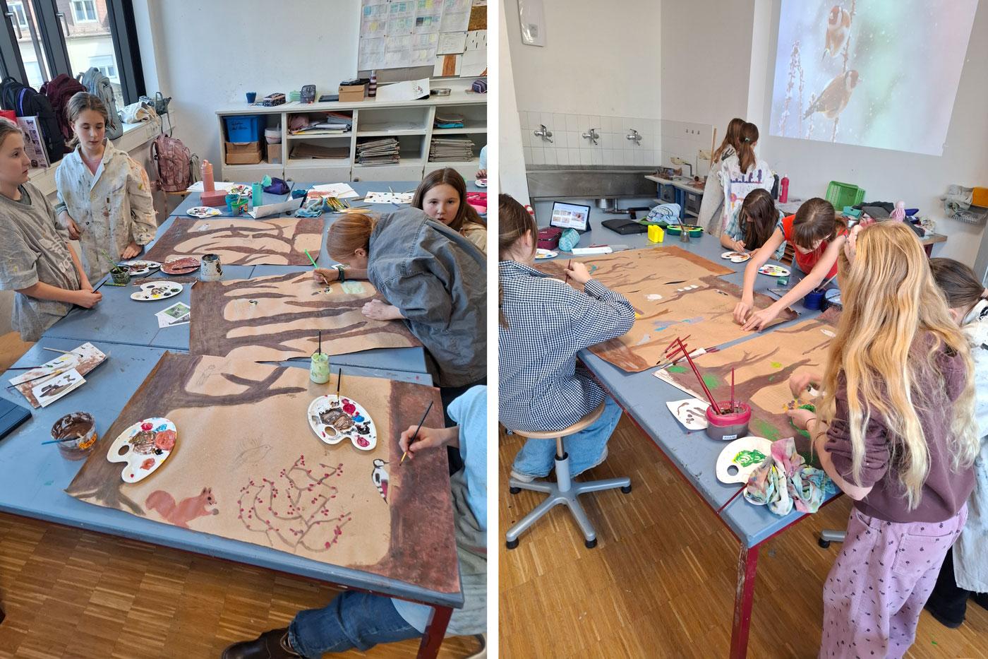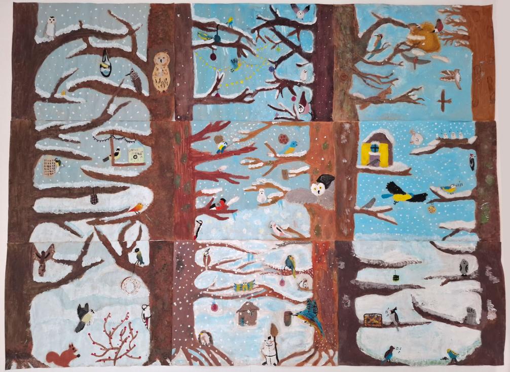 In den vorausgehenden Unterrichtsstunden beschäftigten sich die Schülerinnen damit, wie Bäume wachsen, wie verschieden Arten von Baumrinden dargestellt werden können, welche Farben Schnee annehmen kann, welche heimischen Vögel den Winter bei uns verbringen, und wie man ihre Bewegungen künstlerisch darstellen kann. All dieses Wissen floss in das neue Bild ein – und das Ergebnis spricht für sich!