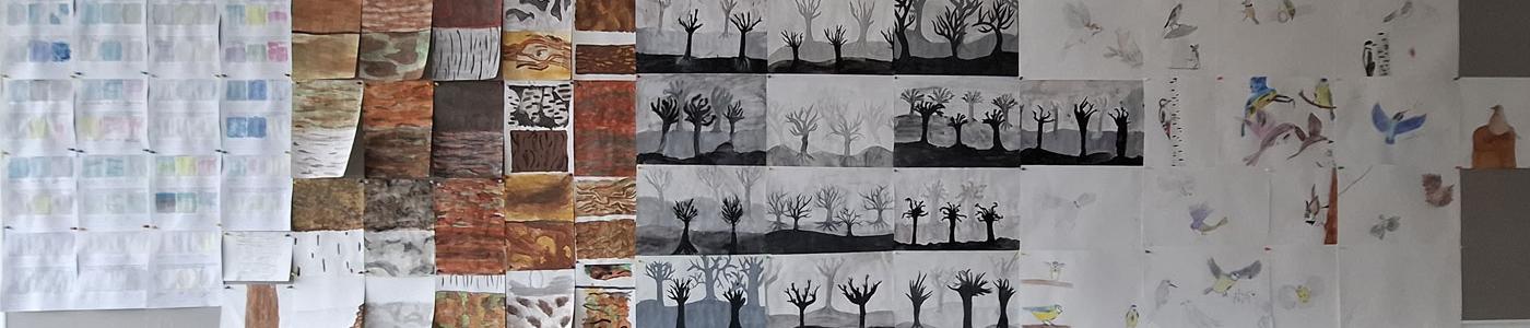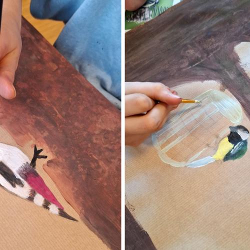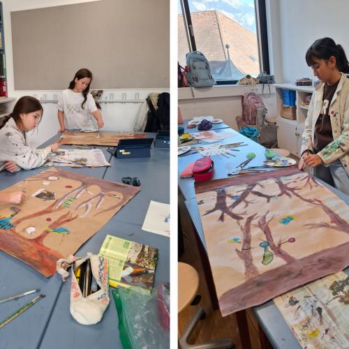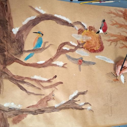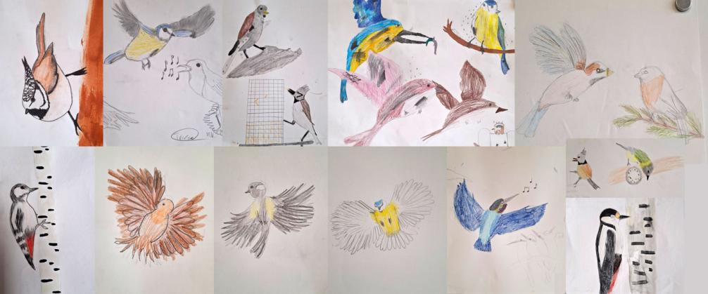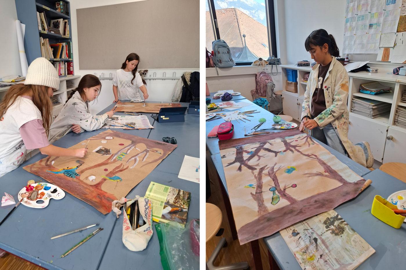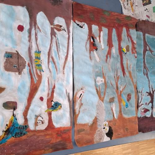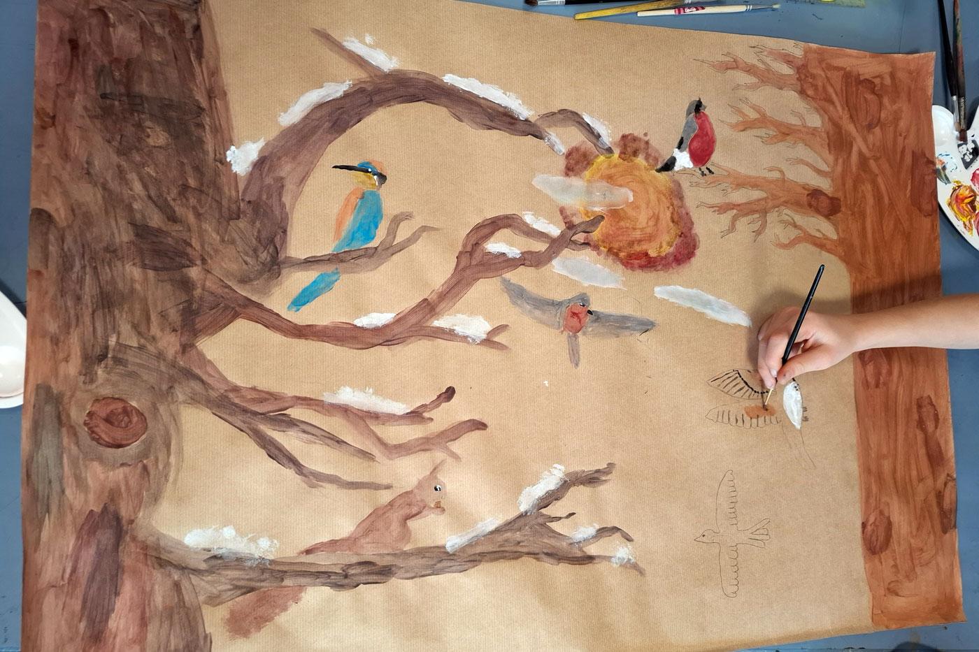 In den vorausgehenden Unterrichtsstunden beschäftigten sich die Schülerinnen damit, wie Bäume wachsen, wie verschieden Arten von Baumrinden dargestellt werden können, welche Farben Schnee annehmen kann, welche heimischen Vögel den Winter bei uns verbringen, und wie man ihre Bewegungen künstlerisch darstellen kann. All dieses Wissen floss in das neue Bild ein – und das Ergebnis spricht für sich!