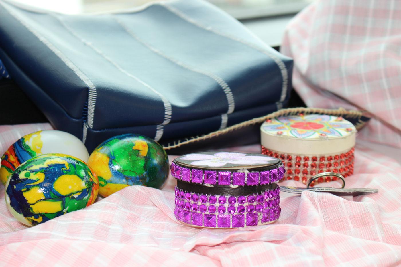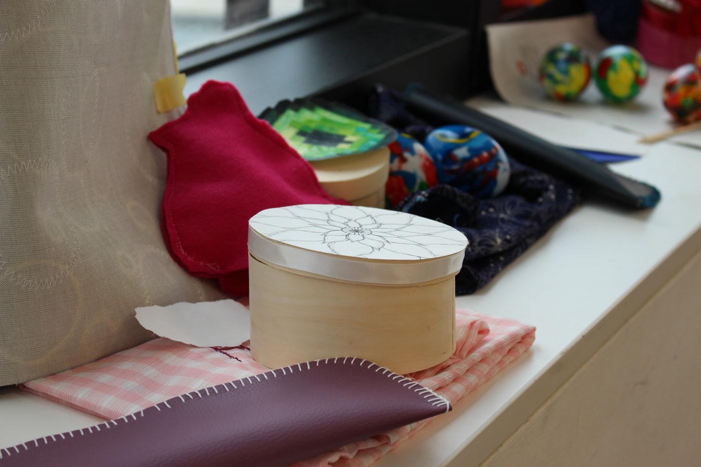 Im Vorfeld entstanden kleine Töpfchen und daraus entwickelte sich die Idee "Gefäße", "Behälter", liebevoll zu gestalteten, "Aufbewahrungsräume" an sich zu schaffen. Dazwischen schmuggelte sich noch der Osterhase und ein paar Eierchen in bunten Farben sowie ein paar wärmende Oster-Filz-Hühnchen.