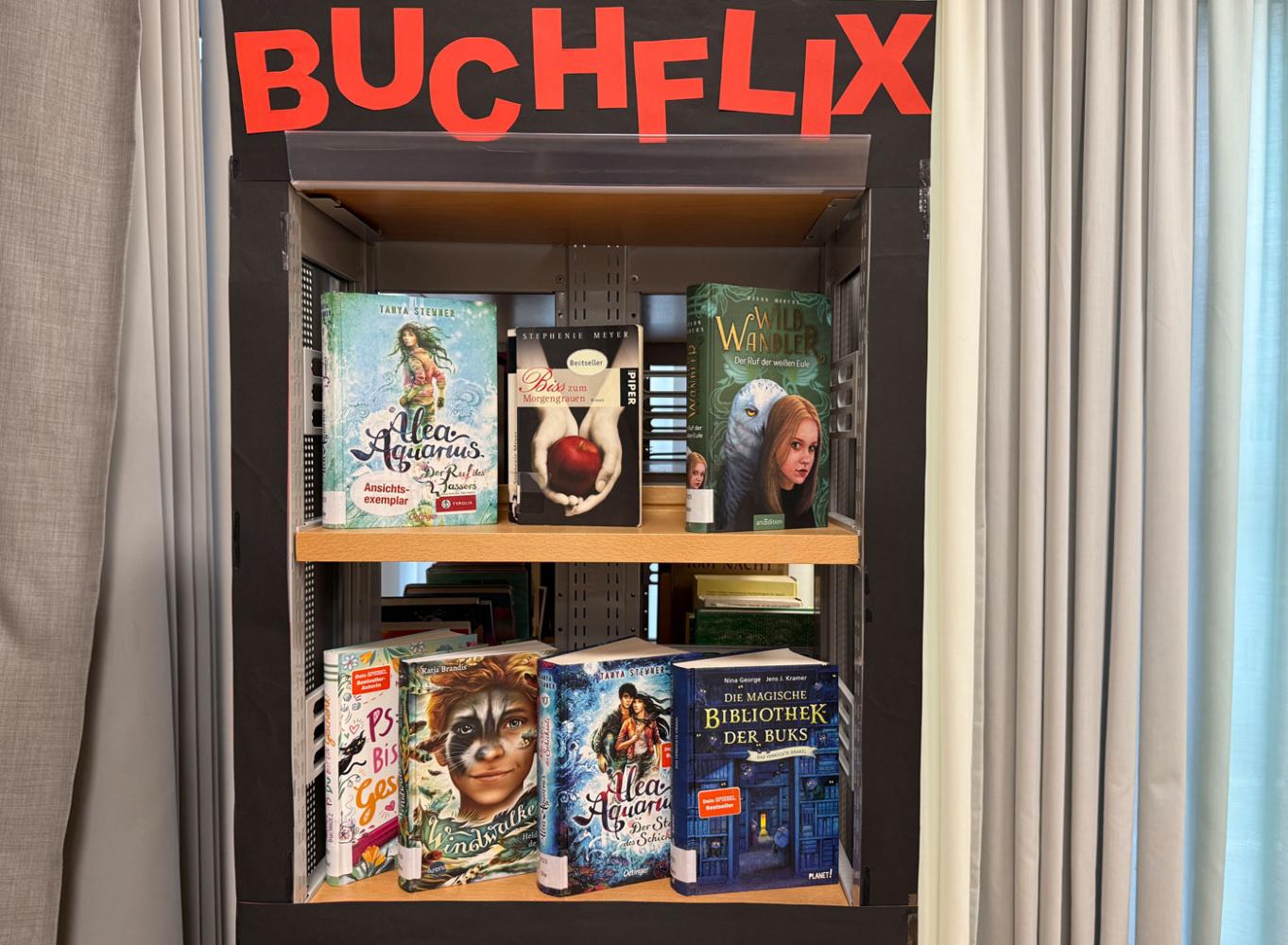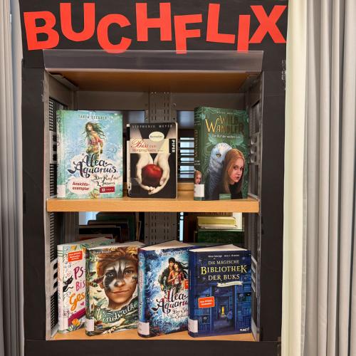 Wir haben in der unverbindlichen Übung „Leseclub“ das Projekt „Buchflix“ fortgesetzt. Unsere Buchempfehlungen sowie Vorschläge für lesenswerte Buchneuerscheinungen für gleichaltrige Schüler:innen (10-13 Jahre) findet ihr in der 1. Etage im Gang der 1.Klassen. Diese Empfehlungen stehen größtenteils für euch zur Ausleihe in unserer Bibliothek zur Verfügung. Achtet auf den gelben Kreis mit dem Hinweis „In der Bibliothek“. Zusätzlich findet ihr in dort ein „Buchflix-Regal“, in dem einige Bücher, die wir empfehlen (siehe Buchflix-Plakat), zu finden sind.