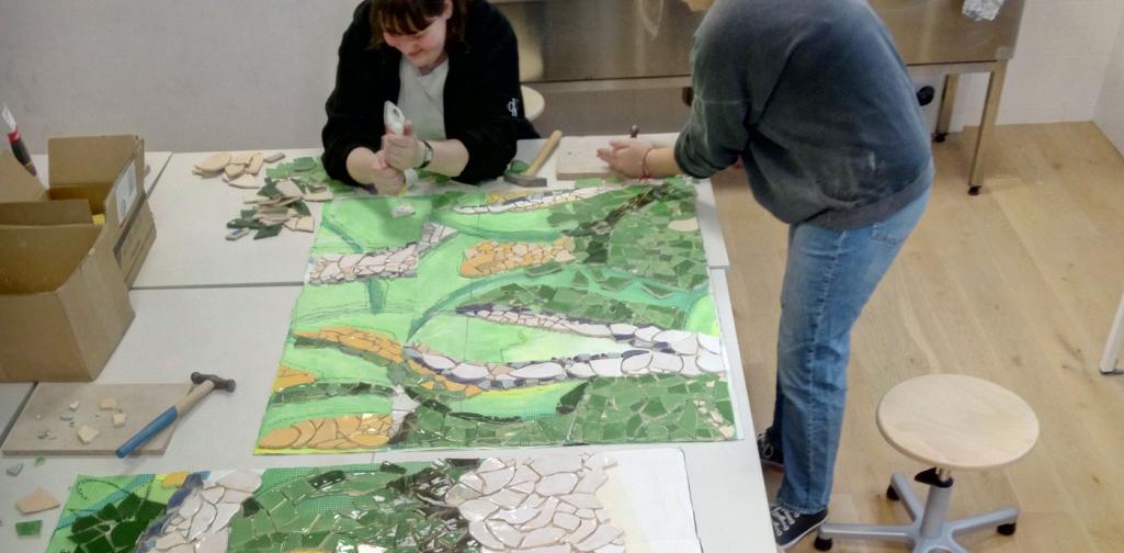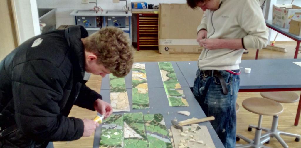 Nebeneinander in wechselnden Arbeitsgruppen legten wir die 15 Einzelflächen, in die wir das Steinchenwerk gegliedert hatten. Und dank der jahrelangen Übung in der bildnerischen Praxis war es den Schülerinnen und Schülern auch leicht möglich, wohl individuell, dabei aber „im Chor“ zu malen, sodass man im fertigen Werk die verschiedenen Hände nicht sieht.