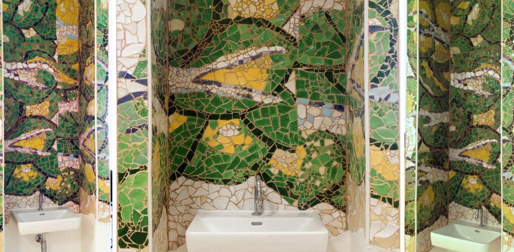 Ein Keramik-Mosaik sollte es werden. Erstens, weil wir so mithilfe des schuleigenen Brennofens das gesamte Material für das 8 m² große Fliesenwerk incl. Farben und Farbauftrag selbst herstellen konnten, und zweitens, weil das Mosaik mit seiner tastbaren und zart profilierten Oberfläche ein Stück Innenarchitektur ist und wir das Architektonische – auftragsgemäß – ja in der Gestaltung mitreden lassen wollten. Wir breiteten also das Bildmuster so über die fünf übereck gestellten Wandflächen, dass sich für die Betrachtenden ständig neue, eigenständige und quasi bewegliche Ansichten ergeben können, wenn sie im Vorbeigehen Bildteile hinter den vorspringenden Seitenwänden verschwinden bzw. auftauchen sehen.