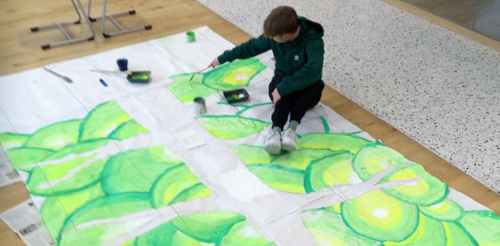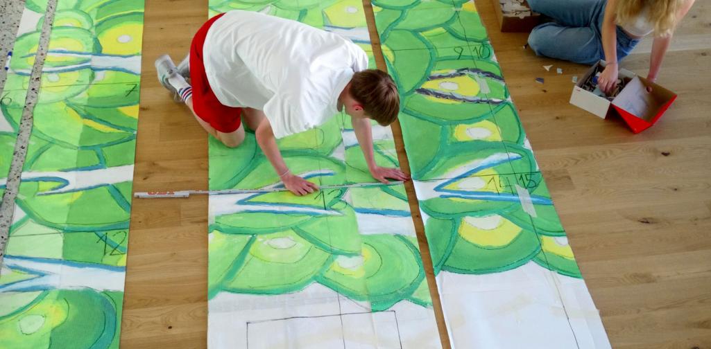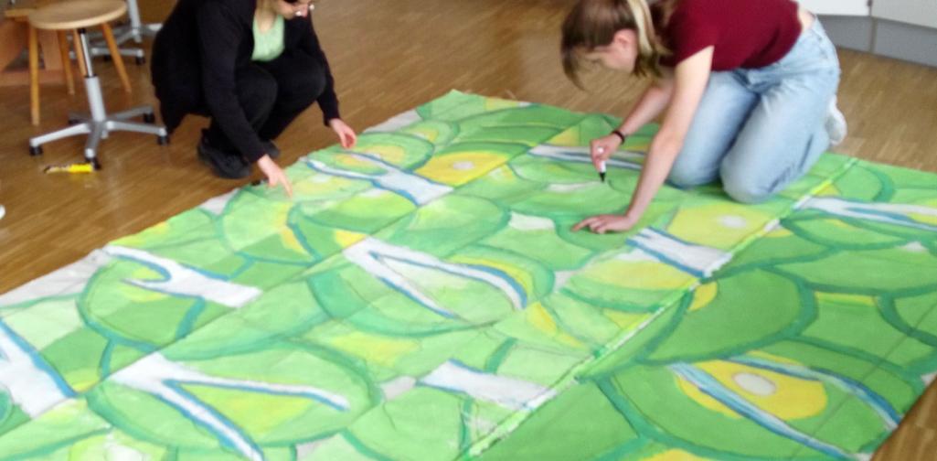 Im Herbst 2022 starteten die Schüler:innen mit einem Wettbewerb, aus dem der Entwurf von Kilian Kollmannsberger (7C 2022/23) als jener, der umgesetzt werden soll, hervorging. Im Schuljahr 2022/23 wurde die fertige Komposition erarbeitet und im Schuljahr 2023/24 ging es an die konkrete Ausführung.