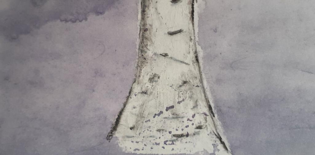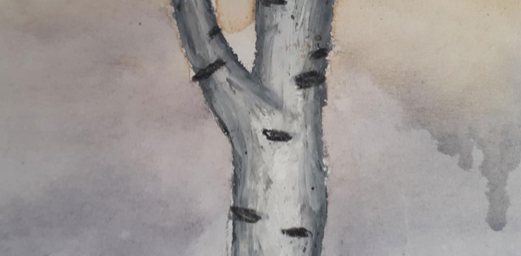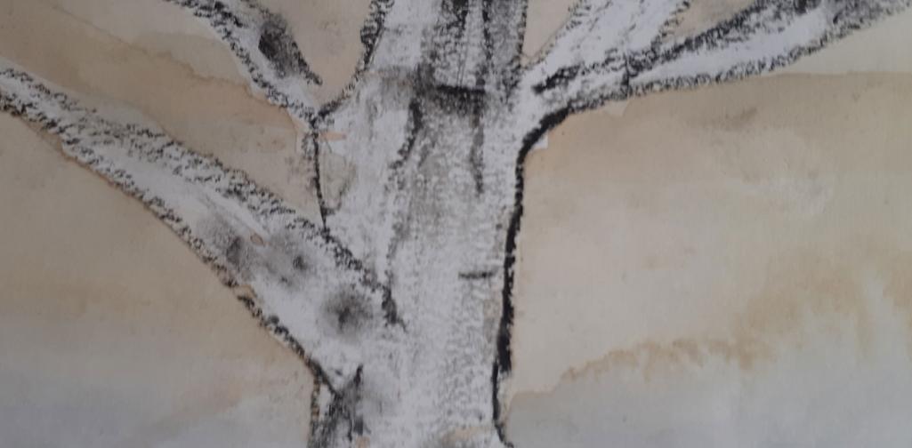 Ein Farbverlauf von Kamillen- über Schwarz- bis zu Beerenteefarben ergänzt die Ölkreiden-Baumstämme der jungen Unterstufen - SchülerInnen sehr harmonisch.