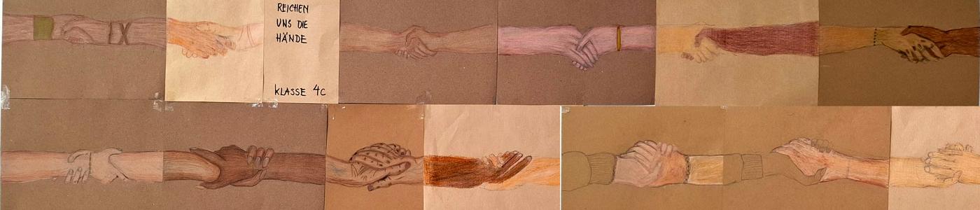 Im Kunstunterricht der 4C schufen die Schüler:innen auf braunem Papier jeweils ein Werk, auf dem sich zwei von ihnen die Hände reichen. Die vorgegebene Blattaufteilung sorgte dafür, dass sich alle Einzelbilder zu einem zusammenhängenden, bandartigen Panorama verbinden. Dadurch entstand ein gemeinsames Kunstwerk, das sowohl visuell als auch symbolisch für Zusammenhalt und Vielfalt steht.