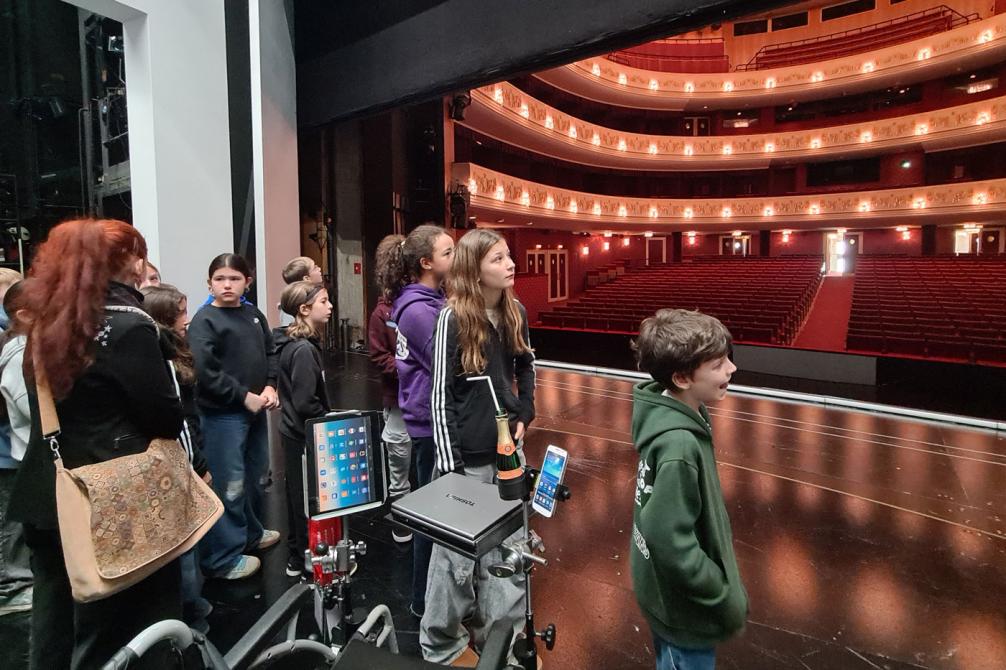 Am 18.Dezember führte Frau Wildlinger die Schülerinnen und Schüler der Klasse 1b durch das Große Haus des Tiroler Landestheaters beginnend im Großen Saal. Vorbei am Orchestergraben ging es hinauf auf die Bühne, wo die Drehbühne extra für die Schüler: innen in Bewegung gesetzt wurde und sie ohne ihr Zutun sich einmal im Kreis auf der Bühne bewegten. Gleichzeitig blinkten Scheinwerfer von allen Seiten und welche technischen Stückeln auf der Bühne sonst noch so gespielt werden, wurde mit großen Augen betrachtet. Dann wanderte die Klasse die labyrinthartigen Gänge entlang in den Keller, durch die Schlosserei und Tischlerei in den großen Malsaal.