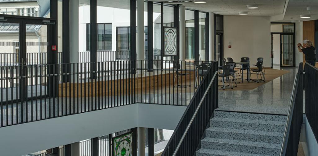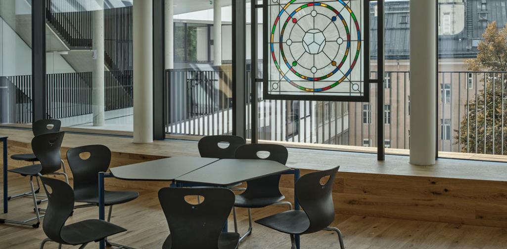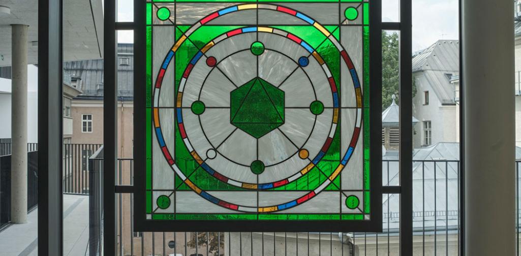 - In der Bibliothek wird ein Beleuchtungskörper mit Glaskugeln angefertigt. Die Farben der Glaskugeln entsprechen den Farben der Vitragen. Die Anfertigung wird in einer Zusammenarbeit mit der Glasfachschule Kramsach realisiert und stellt damit eine Verknüpfung der Glaskunsttradition in Tirol mit unserem Kunstwerk her.