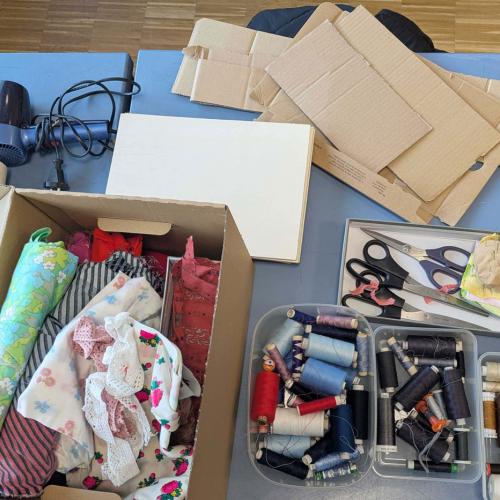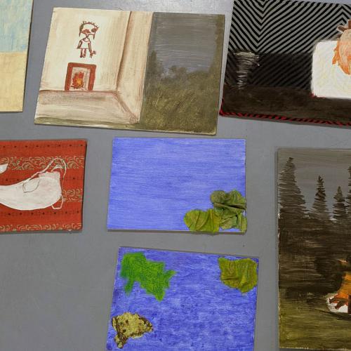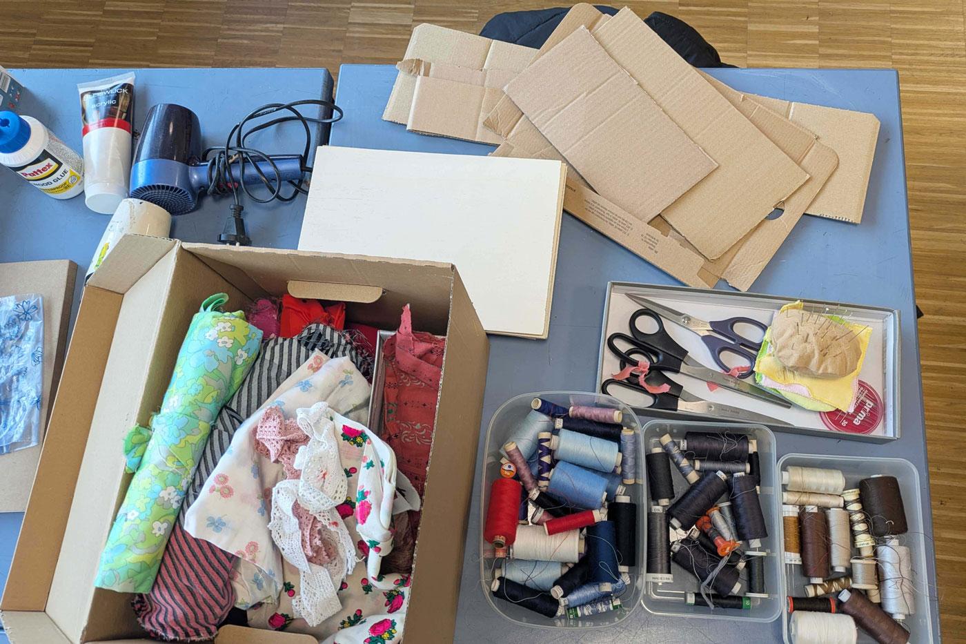 Aus einer gemeinsam erfundenen Geschichte wuchsen erste Bilder im Kopf. Ideen, Worte und Skizzen wurden festgehalten. Anschließend wurden mitgebrachte kleine Schätze intuitiv ausgewählt, ausgeschnitten, geklebt, genäht und schließlich mit der selbst angerührten Farbe verbunden. Aus Holz, Karton und Stoff entstanden Leinwände, auf denen sich Schicht für Schicht ganz besondere Arbeiten entwickelten.