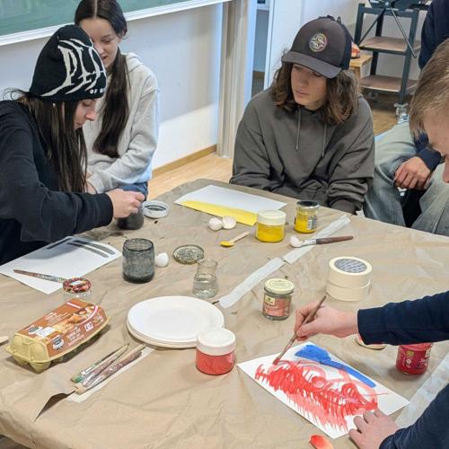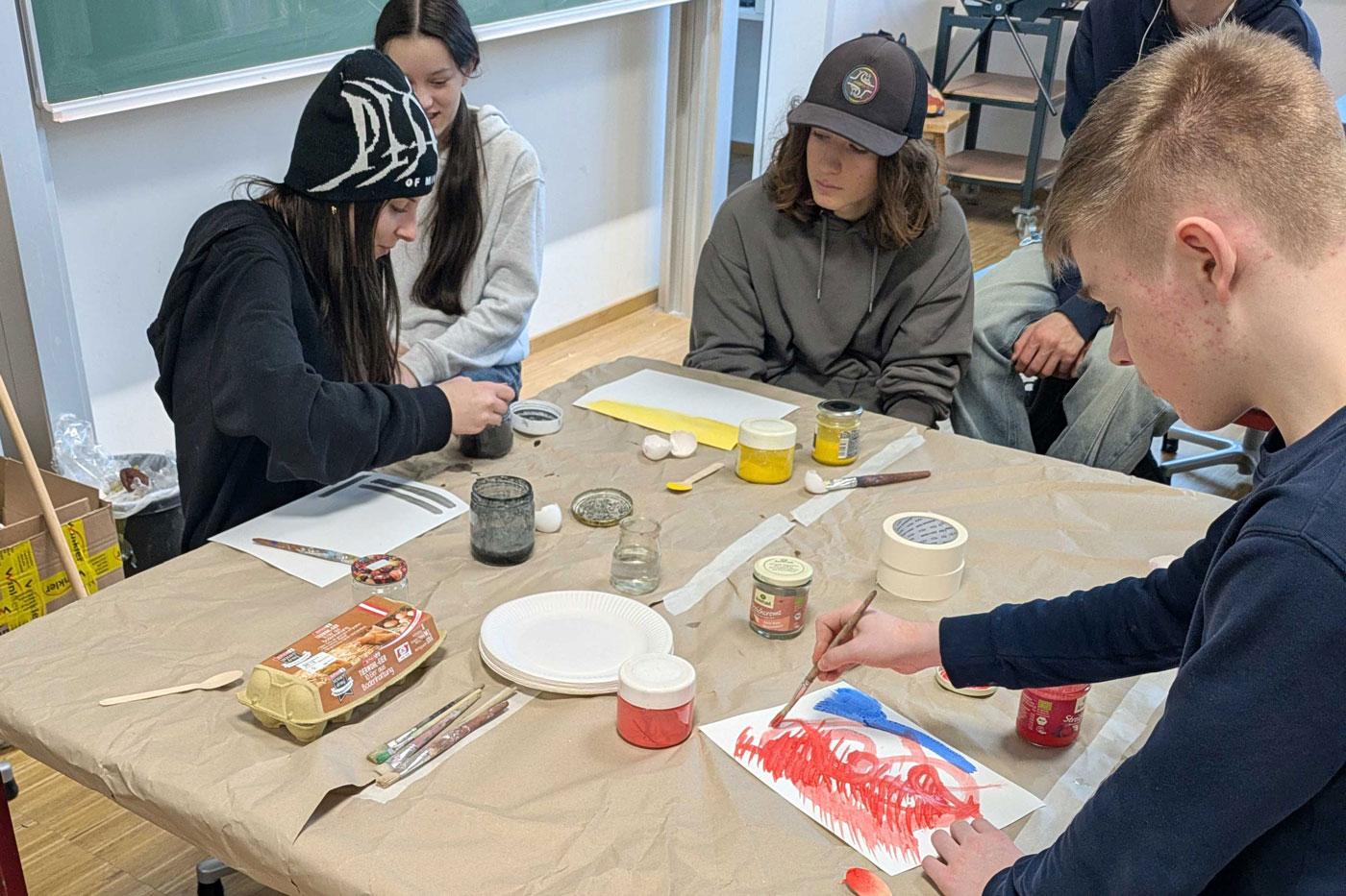 Mit dem Besuch der Künstler:innen Ina Hsu und Sebastián Toledo eröffnete sich der fünften Kunstschwerpunkt-Gruppe eine Reise in malerische Welten. Zu Beginn wurde einer alten Rezeptur gefolgt: Aus wenigen Zutaten stellten die Schüler:innen gemeinsam Eitempera her und erfuhren dabei, welche Bedeutung Farben in der Natur und im Alltag haben.