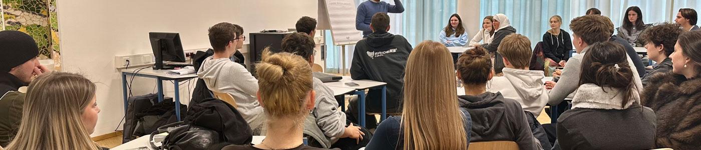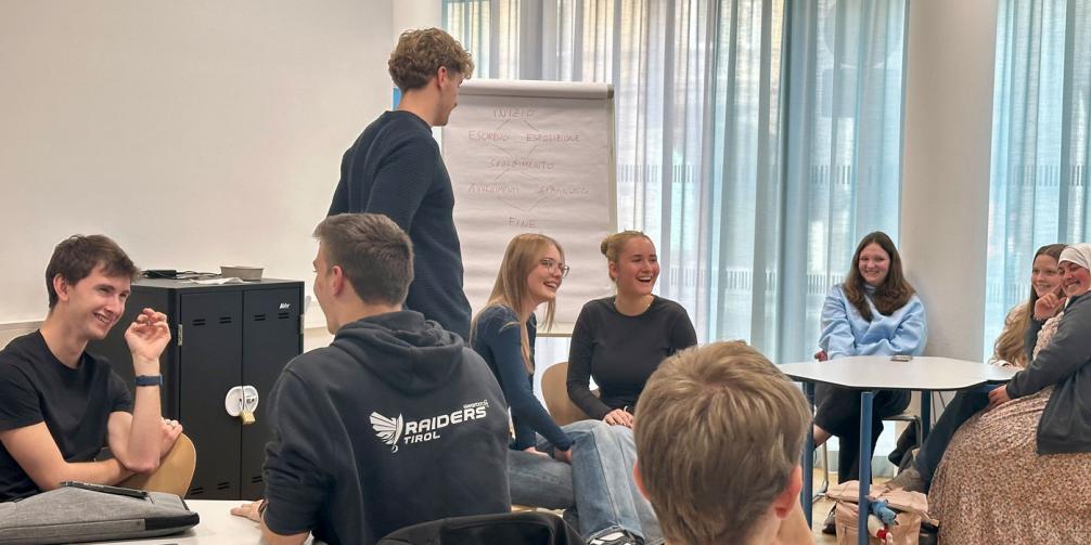 Auf ebenso unkonventionelle wie unterhaltsame Art nahm der italienische Schriftsteller und Schauspieler Gigi Colasanto am 27. November 2025 die achten Klassen in zwei kurzweiligen Stunden mit auf eine Reise in die Welt des Erzählens und Schauspielerns. Von der ersten Minute an wurden sie selbst zu den Akteuren der Veranstaltung: Unter Gigis Anleitung erfanden sie spontan Szenen, setzten diese um und reflektierten anschließend ihre Wirkung.
