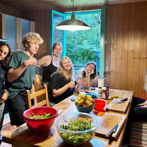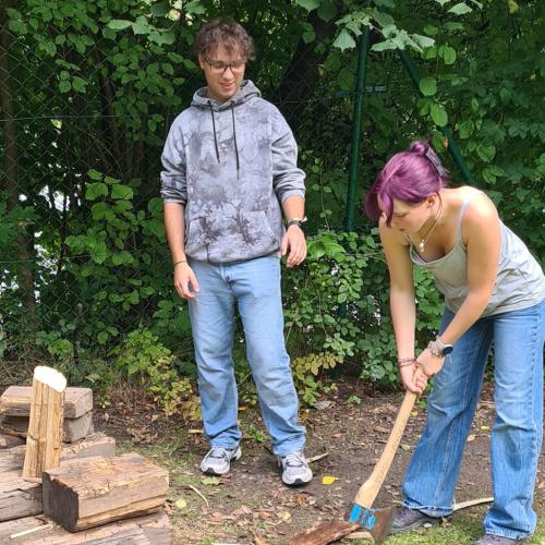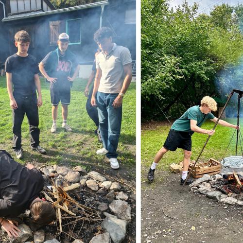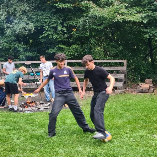 Dann wurde gegrillt – und wie! Manche hackten Holz, andere hielten das Feuer am Leben, die Küchencrew schnippelte den Salat, kochte Kartoffeln und die Übrigen… naja, genossen einfach die Playlist oder spielten Fußball auf der Wiese. Das Wetter war wie bestellt: leicht bewölkt, ein bisschen Sonne, perfekt zum Draußensitzen. Am Abend hockten wir alle gemeinsam ums Feuer, voller Energie, guter Laune und gegrillter Köstlichkeiten im Bauch.