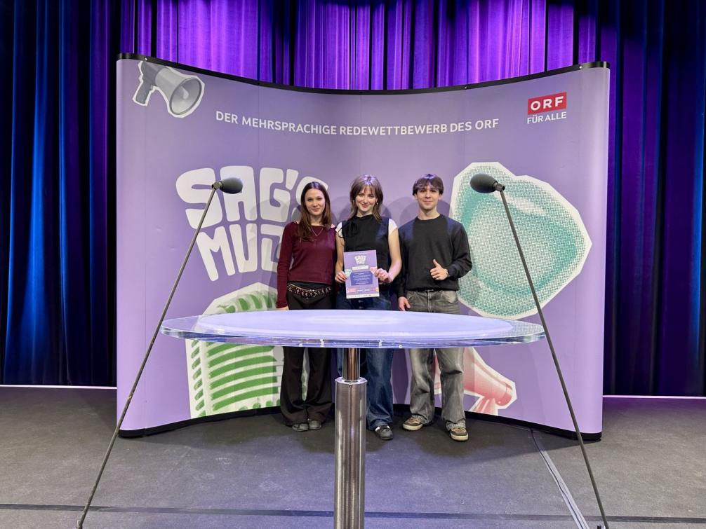 Wie jedes Jahr qualifizieren sich die besten Reden aus der Vorrunde (Audition) für das Landesfinale, das in allen Bundesländern stattfindet. Von den sechs angetretenen Schüler:innen unserer Schule schafften es fünf in das große Speech Off im ORF Landesstudio am 24.02. Mit Reden über Migration und Demokratie (Ben – Deutsch & Englisch), die Bedeutung der Privatsphäre in den Sozialen Medien (Emana – Deutsch & Bosnisch), das echte Leben online und offline (Hanna – Deutsch & Serbisch), die Generation der Jugendlichen als Sorgenkinder und Hoffnungsträger (Otto – Deutsch & Englisch) sowie die aktuelle Lage der Menschenrechte in unserer Gesellschaft (Ylvi – Deutsch & Englisch) überzeugten die Jugendlichen die Jury.