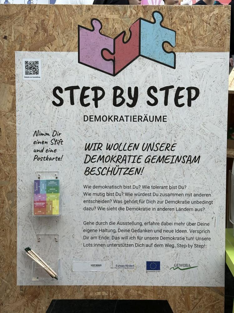 Dabei setzten die Jugendlichen sich nicht nur mit den eigenen Werten auseinander, sondern erfuhren auch, in welchen Bereichen demokratische Teilhabe bzw. Mitbestimmung ertragreich und besonders wünschenswert ist. Die interaktive Ausstellung „Step by Step“, die den weiten Weg von Bremen nach Innsbruck auf sich genommen hat, eignete sich dafür besonders gut: Sie macht die Dynamik und die stetige Weiterentwicklung der Demokratie unmittelbar erlebbar.