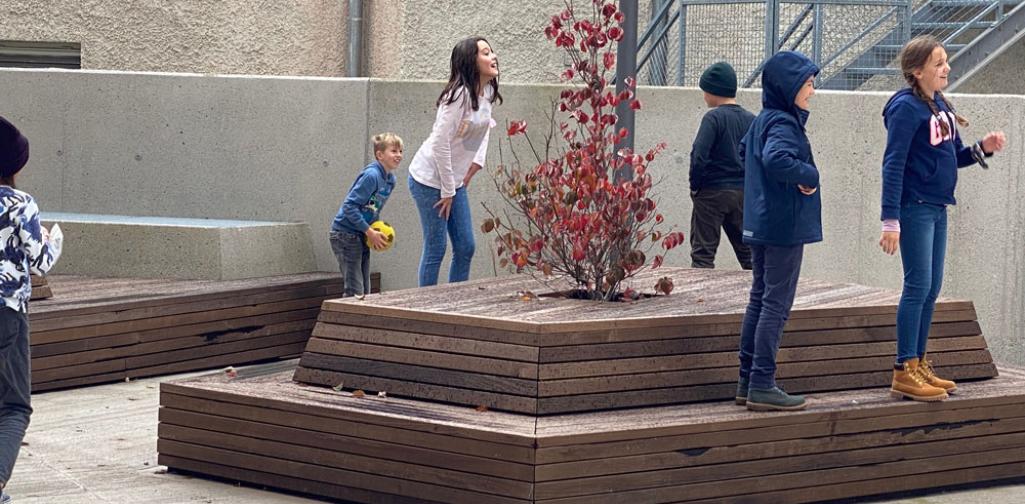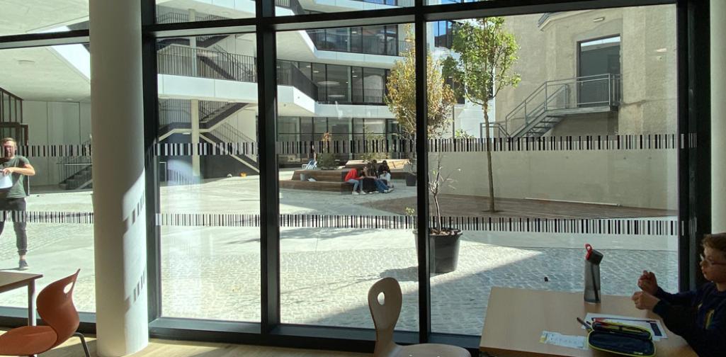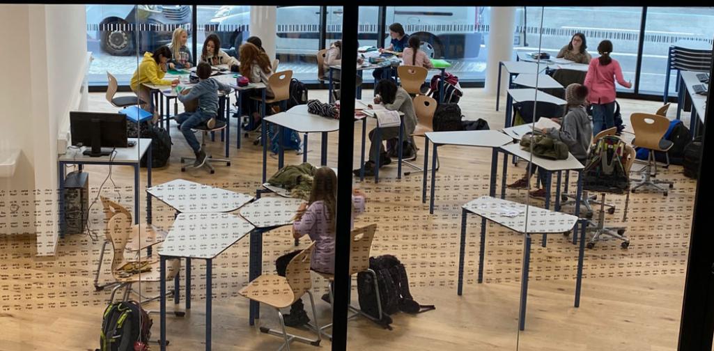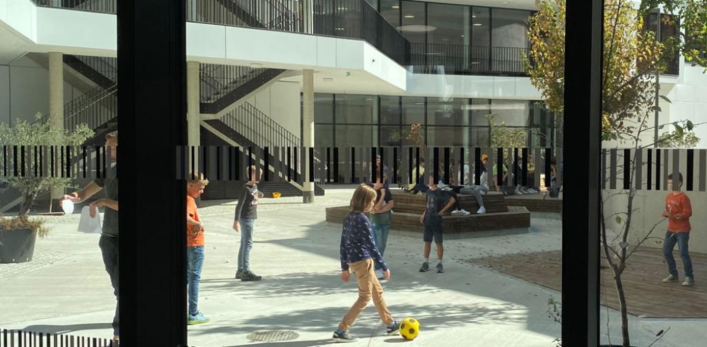 - Die Architektur der Schule spielt den oben genannten Zielen in die Hände. So steht der NABE der Großteil des Erdgeschoßes inklusive des Pausenhofs zur Verfügung und die Kinder können ihre (Lern)umgebung nach ihren individuellen Bedürfnissen erkunden und nutzen. So befinden sich die Schüler:innen am Nachmittag auf Stühlen oder Sitzkissen in der Bibliothek, zur Vorbereitung auf eine Schularbeit geschützt wie in einer Höhle unter den Treppen in der Aula, im Medienraum zur Gestaltung eines Referats, an sonnigen Tagen auf den Bänken im Pausenhof beim Schreiben eines Deutschaufsatzes oder im Speiseraum, wo man beim Erledigen der Hausaufgaben leicht vom Fleiß der Mitarbeiter:innen der Lebenshilfe angesteckt wird.